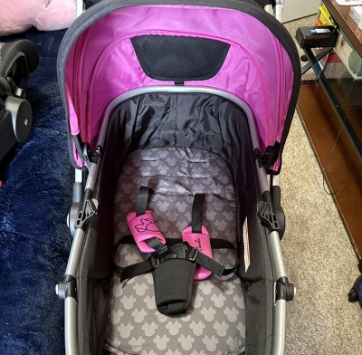 The Disney baby Mickey Mouse grow and Go travel system has proven to be a game-changer for our family outings. The set includes a stroller and a car seat. The stroller itself is sturdy yet lightweight, allowing for easy maneuverability. The car seat seamlessly clicks into the stroller, providing a smooth transition from car to stroller. The overall design is not only functional but also very cute. I love how it had a fun in Al tray for the baby and a cup holder for the parent. I currently have a mocking bird stroller and comparing both products that are both worth the price, each one offers different unique characteristics. I highly recommend this stroller travel set for its practicality, durability, and stylish design. I would definitely purchase this again in mini mouse for my baby girl.