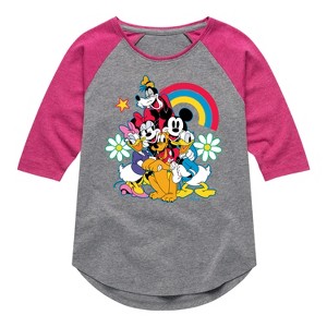 Disney - Character Group Rainbow Flower - Youth Girls Raglan Graphic T-Shirt - Add a touch of magic to your wardrobe with this graphic apparel featuring iconic Disney designs. Showcasing beloved characters and classic imagery, each piece combines nostalgic charm with modern style—perfect for Disney fans of all ages. Whether you're headed to the parks or just adding whimsy to your everyday look, these graphics bring the magic to life.