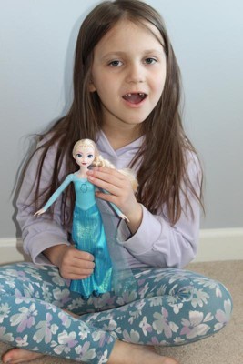 [This review was collected as part of a promotion.] Elsa was great. CeCe was leary at first but loved she could push the button to have her sing. She figured her out & pointed to her hair, shoes, & blue eyes! She is a little loud. After an hour of play she loved her