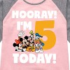 Mickey & Friends - Hooray I'm 5 Today - Toddler And Youth Girls Raglan Graphic T-Shirt - Add a touch of magic to your wardrobe with this graphic apparel featuring iconic Disney designs. Showcasing beloved characters and classic imagery, each piece combines nostalgic charm with modern style—perfect for Disney fans of all ages. Whether you're headed to the parks or just adding whimsy to your everyday look, these graphics bring the magic to life.