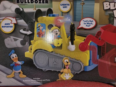 [This review was collected as part of a promotion.] Not only is this Mickey bulldozer super cute, it has lots of functions for pretend truck play! The back hand boom moves out and up and down. The bulldozer glides easily across floors. The figures easily can sit in and out of the truck cab. The only reason I gave 4 stars is the front loader bucket does not really function as a true bulldozer. It does move slightly up and down. The bucket is not capable of dumping. The sounds are fun upon the top button - easy for toddler to understand. Fun toy!