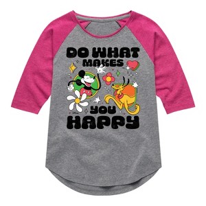 Disney - Mickey & Friends - Retro Style - Do What Makes You Happy - Toddler And Youth Girls Raglan Graphic T-Shirt - Add a touch of magic to your wardrobe with this graphic apparel featuring iconic Disney designs. Showcasing beloved characters and classic imagery, each piece combines nostalgic charm with modern style—perfect for Disney fans of all ages. Whether you're headed to the parks or just adding whimsy to your everyday look, these graphics bring the magic to life.