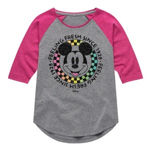 Disney - Mickey & Friends - Feeling Fresh Since 1928 - Retro Checkered Style - Toddler And Youth Girls Raglan Graphic T-Shirt - Add a touch of magic to your wardrobe with this graphic apparel featuring iconic Disney designs. Showcasing beloved characters and classic imagery, each piece combines nostalgic charm with modern style—perfect for Disney fans of all ages. Whether you're headed to the parks or just adding whimsy to your everyday look, these graphics bring the magic to life.