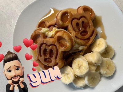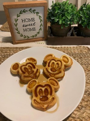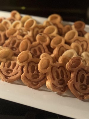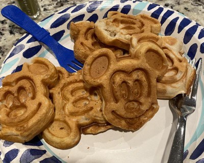 [This review was collected as part of a promotion.] Weekend morning breakfast was a huge hit! This is super easy to use & fun for the kids to help & eat. I would say to use cooking spray to make the waffles come out easily. We had 3 kids & 4 adults over for breakfast to test it out. Loving that this is double sided so you can make 6 at once, taking approximately 3-4 minutes to completely cook. Would recommend for Disney park like waffles at home.