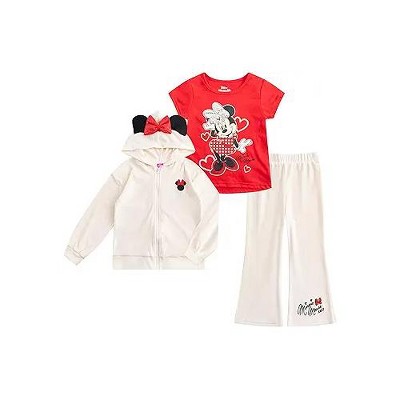 • Contains one white velour zip up sequin oodie featuring a mini Minnie silhouette, black ears and a red ribbon on the hood, and a Minnie Mouse silhouette on the back adorned with a red ribbon. Paired with matching grey sweatpants with a stylish Minnie Mouse print, and a red short-sleeve T-shirt with an adorable Minnie Mouse print.