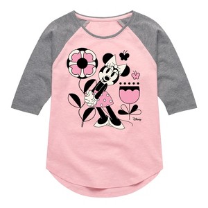 Disney - Minnie Mouse with Flowers & Butterflies - Toddler & Youth Girls Raglan Graphic T-Shirt - Add a touch of magic to your wardrobe with this graphic apparel featuring iconic Disney designs. Showcasing beloved characters and classic imagery, each piece combines nostalgic charm with modern style—perfect for Disney fans of all ages. Whether you're headed to the parks or just adding whimsy to your everyday look, these graphics bring the magic to life.