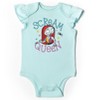 • Lap shoulders for easy dressing and quick diaper changes; 3-snap closure for quick and easy diaper changes; Awesome screen print design; Picot edge trim; Awesome soft hand screen print with glitter; Elastic waist for better fit