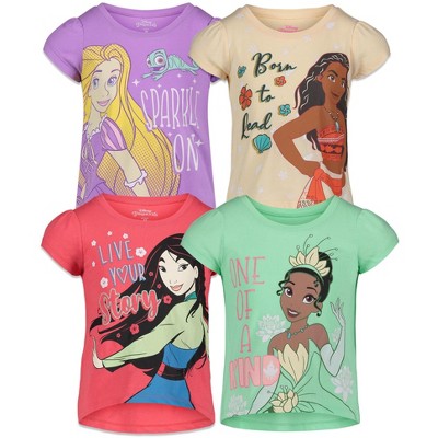 Bring royal charm to every day with this magical 4-pack of Disney Princess tees! Featuring Belle, Cinderella, Ariel, and Jasmine in sparkling, glitter-accented designs, each shirt is full of fairytale flair little ones will adore. Made from 100% cotton with a comfy crew neck and easy pull-on fit, these officially licensed tees are perfect for school days, playdates, or princess-worthy adventures. A dreamy wardrobe essential fit for your little royal!