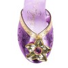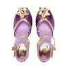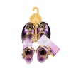 Step into a world of enchantment with these elegant Rapunzel Shoes, part of the Disney Princess Signature Collection. The shimmering purple shoes feature a round closed toe, adorned with a whimsical, pierced scroll design. At the heart of each shoe lies a radiant Sundrop flower gemstone and gold trim wraps gracefully around the shoe, extending to the kitten heel like a golden thread of destiny. The gold ankle strap, enhanced with a sparkling gem button, is the finishing touch to these beautiful shoes.