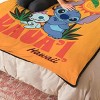 - Double-Sided Design: Enjoy two distinct Stitch designs in one blanket. One side features Stitch wearing palm tree sunglasses with a tropical leaf pattern, while the reverse side shows Stitch and Scrump leaning against a palm tree with “Kaua’i Hawaii” text