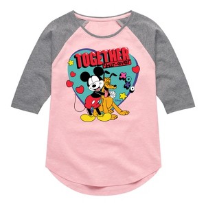 Disney - Together Fur Ever Mickey Pluto - Youth Girls Raglan Graphic T-Shirt - Add a touch of magic to your wardrobe with this graphic apparel featuring iconic Disney designs. Showcasing beloved characters and classic imagery, each piece combines nostalgic charm with modern style—perfect for Disney fans of all ages. Whether you're headed to the parks or just adding whimsy to your everyday look, these graphics bring the magic to life.