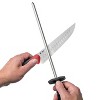 [This review was collected as part of a promotion.] I use sharpening steels weekly because they work. For quick touchups, I prefer steel over diamond or ceramic rods—those need a gentler hand, but steel can still improve an edge even if the technique isn’t perfect. Diamond and ceramic have their place, though. I usually reach for them maybe twice a year, whenever a blade needs serious adjustment. Sharpening in midair might look cool, but I’d rather keep things practical. Pinning the tip to a cutting board gives me better control and consistency. One heads-up: I once dragged the steel across the blade face by accident, and it left a streak of scratches. Not the end of the world, but definitely something to avoid.