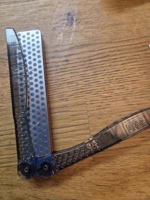 [This review was collected as part of a promotion.] This is a really nice hand held sharpener. Once the handles are locked in it’s really solid. The coarse side prepares the blade really nicely with a good clean edge. The fine side hones it well with a nice fine edge. The sharpness is good enough for most cutting chores. It will take some practice to maintain the correct angle consistently. That’s part of the fun. It’s also light and compact to be carried around without noticing you even have it.