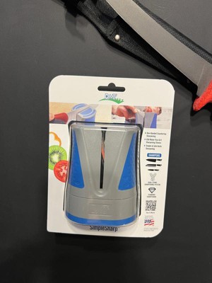 [This review was collected as part of a promotion.] The SimpleSharp Diamond Sharpener is quick and simple to use and easy to clean. When using, it sits securely on a flat counter without slipping, but must be held in place. Although you have to rotate the sharpener when using for a second set of swipe throughs, with its two stone system, it effectively sharpens a dull, straight edged knife with ease. This is a product that I will use repeatedly, as needed, but I don't like the placement of the non-slip grips, which I feel are dangerously placed on either side of the knife opening and can lead to accidental injury.