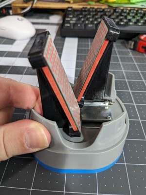 [This review was collected as part of a promotion.] So I've been wanting a convenient kitchen knife sharpener for a while. Something that wasn't one of those drag-through carbide ones though. Those really don't seem like the type to use if you care much about your knives. I saw this one and thought: "Hey, perfect. Let's try it out." I've been a big fan of DMT sharpeners for over a decade. I've had the black (coarse) and blue (medium) bench stones for a really long time now, and they still work very well. I also have one of the extra fine diamond plates that I bought around the same time, and that one is still one of my favorite sharpening stones. So I was quite excited to try this out. It turns out I'm a bit disappointed, if I'm honest. So the idea of this sharpener is really good, I think. Use smaller versions of the DMT diamond stones in a V shape, pull-through kitchen counter sharpener. It feels _okay_ for the most part. I'd be more impressed with some extra weight in the base, but it's not too bad. There's quite a lot of flex in the top portion, due to the fact that it's a very thin molded plastic. That's not a super big deal, but once again it adds to the feeling of an inexpensive product. Which, to be honest, this is. This is not a premium kitchen knife sharpener, and as such shouldn't be judged to that standard. Okay, so it's a bit of a budget model. That's alright. For the currently listed price I think the build quality is quite good. But how well does it work? That's the real question. Well, pretty well, I'd say. Except for one thing. One kind of big thing... So, the way this is designed is that the two little diamond plates/stones are held in a V shape and you drag the knife through. The outer casing keeps your knife straight up and down so you don't end up cutting one side more than the other. That works well enough, but the big issue I see is the fact that there are only two cutting surfaces; one on each side. They are just under an inch wide each, there is about 1/4 inch between them and there is about 1/4 of an inch from the edge of each cutting surface to the outside of the cover.. Why is this a problem? Because this means that when you drag a typical kitchen knife through there is about 1.5 inches on the right side of the blade towards the handle that will never see a sharpening stone. And that is... not ideal. I'm not sure about you, but when I prep food for cooking I tend to use whatever part of my knife remains the sharpest from the last sharpening or honing, and with this sharpener there will a 1.5 inch section of any blade that will never be properly sharp. I think they could solve this (or at least mitigate it) by having additional, smaller sharpening surfaces on each side in an alternating pattern. That is the primary reason I gave this 4 stars instead of 5. There are a couple of other small issues I also have though. It claims to automatically adjust to the angle of the blade you're sharpening, but I don't see how that could be possible. Maybe I'm misunderstanding, but the sharpening plates push apart equidistantly the harder you push down while pulling a blade through, but they never actually change the angle they make to each other. This means that if your knife edge isn't already at this angle or shallower, you'll only ever be abrading the side of the edge until you reach the apex, which would take quite a long time for most knives. The other small issue is the somewhat sloppy way the sharpening plates are affixed to the base, through the sliding mechanism. It just feels like it could have much tighter tolerances. So, it's not all bad though. Those are just the things I felt needed some focus. I don't think a customer would appreciate not knowing that ahead of time. There is also a lot of good though. I do think it should last a long time. Like I said, I've had diamond stones from this company, that look pretty much identical to the ones in this product but bigger that have lasted me well over a decade without wearing out completely. And even if they do, these are replaceable. And they're replaceable from a brand that's been around a long time and not likely to go anywhere any time soon. Compared to some brands that pop up and disappear after 6 months. I also like that the mechanism that allows the surfaces to be pushed apart means that you'll be able to use a larger area of the cutting surface, rather than a very narrow strip that would probably wear out really quickly. So, I will be using this for the foreseeable future, with my less dear knives, at least. And I don't doubt it'll last years.