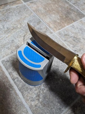 [This review was collected as part of a promotion.] Perfect knife sharpener to have around the house. Can be used easily and sharpens your knives without much effort. Be sure to follow the directions and angle the knives appropriately. My suggestion would be to try it out on knives you dont use as often first. Bottom of the sharpener has a non slide surface which is really helpful when you are aligning the knife.