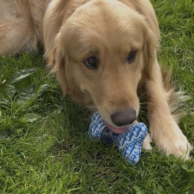 [This review was collected as part of a promotion.] This is the small sized toy and our mini havapoo puppy, Tazzy, loves it. Tazzy is an extra small dog and weighs 4 pounds. The cute plush dog bone toy has a squeaker inside of it so it also makes noise when you push on the side of it. It’s is super cute and a themed dog version of high end brand, so if you are in to designer brands, you will absolutely adore this toy for your dog. If you have a larger dog, I feel the size would be too small for them. But, for a small to medium sized dog, I think this would be a treat for them. I received an incentive to write this review.