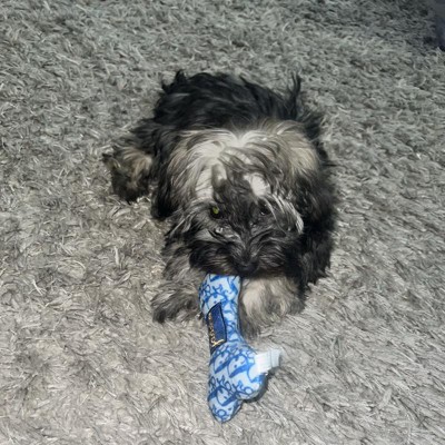 [This review was collected as part of a promotion.] This is the small sized toy and our mini havapoo puppy, Tazzy, loves it. Tazzy is an extra small dog and weighs 4 pounds. The cute plush dog bone toy has a squeaker inside of it so it also makes noise when you push on the side of it. It’s is super cute and a themed dog version of high end brand, so if you are in to designer brands, you will absolutely adore this toy for your dog. If you have a larger dog, I feel the size would be too small for them. But, for a small to medium sized dog, I think this would be a treat for them. I received an incentive to write this review.