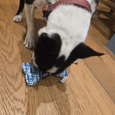 [This review was collected as part of a promotion.] This is a great size toy and really cute. Both of my dogs were play fighting for it which is fun for all of us. The little Dior dog art is so cute. There is a squeaker which we love. The material is thin so this isn’t a toy for chewers. Definitely supervise your dog with it if they are squeaker hunters! It’s super light and fits in my jacket pocket making it easy to take on a walk if there’s a spot to play. Great choice. I received an incentive to write this review.