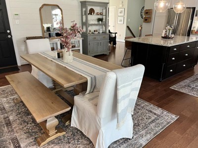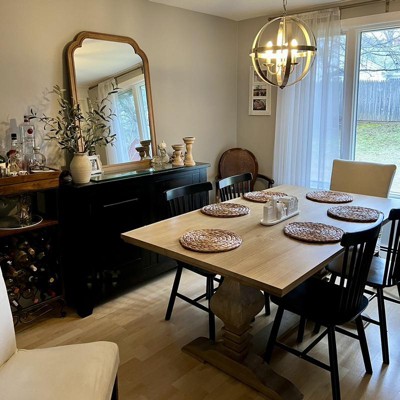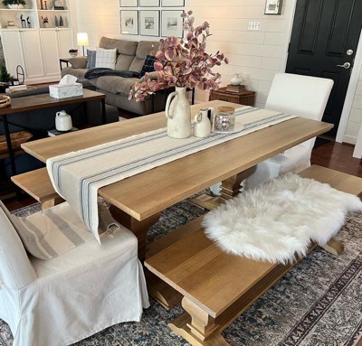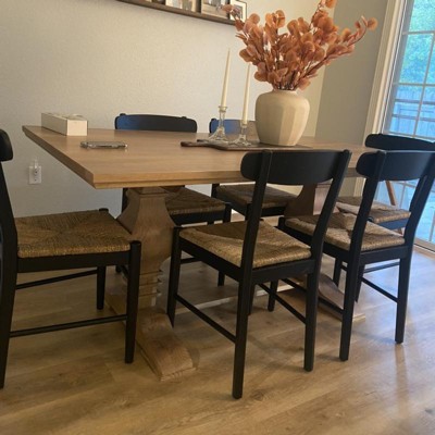 This table is so gorgeous! We just bought it for our new home, pairing it with the matching bench and 2 black chairs (also from target). A steal for this price!