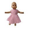 Soft silky sleeveless dress is pink and white stripe print. Comes with a short sleeve bolero style jacket. Handmade and machine washable fabric, dress closes in the back with Velcro. Shown on a 15 inch baby doll and a 16 inch Cabbage Patch Kid doll. This listing is for one doll outfit, the doll is not included.