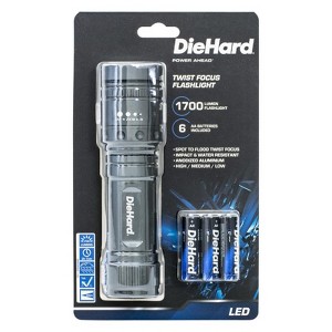 When only the brightest light will do, the DieHard Twist Focus 1,700 Lumen Flashlight has you covered. Durable Pro Grade anodized aluminum construction gives this light a quality feel and finish that is comfortable in your hand. With impact and water resistant design, rubber booted tail cap switch, and a heavy duty, non-slip True Grip handle; this light is ready for the toughest jobs. Twist Focus technology lets you to move from a spot beam to a flood beam, and any point in between - so you not only have power, but also the ability to tailor the beam to your specific needs. Light settings of high, medium, and low mean you will always have the right amount of light for any given task. A flash setting is also included for safety. A unique design which allows the light to stand on its end for hands free lighting.When only the brightest light will do, the DieHard Twist Focus 1,700 Lumen Flashlight has you covered. With an amazing 1,700 lumens of power and an incredible beam distance of 266 meters, this light has the distance and power to light up any situation. Durable Pro Grade anodized aluminum construction gives this light a quality feel and finish that is comfortable in your hand. With impact and water resistant design, rubber booted tail cap switch, and a heavy duty, non-slip True Grip handle; this light is ready for the toughest jobs. Twist Focus technology lets you to move from a spot beam to a flood beam, and any point in between - so you not only have power, but also the ability to tailor the beam to your specific needs. Light settings of high, medium, and low mean you will always have the right amount of light for any given task. A flash setting is also included for safety. Other features include 2 hours and 15 minutes of run time on 6 AA batteries, as well as a unique design which allows the light to stand on its end for hands free lighting. The DieHard Twist Focus Light includes six premium DieHard AA batteries.