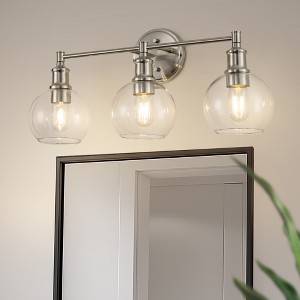 This sophisticated 3-light wall mirror light is designed with a modern nickel finish and features a durable combination of metal and glass for an elegant touch. The fixture includes E26 bulb bases, allowing you to select the bulbs that best suit your needs and preferences (bulbs not included). Perfect for a wide range of applications, including bathrooms, vanities, bedrooms, and dressing areas, this light offers both style and functionality. Its sleek design complements contemporary interiors while providing ample illumination for your space.