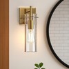 Add a touch of elegance and warmth to your interiors with this modern gold wall sconce. Featuring a sleek metal base and a clear glass shade, this fixture seamlessly blends contemporary design with timeless appeal, making it a perfect addition to various spaces in your home. Supports various bulb types and dimming options.