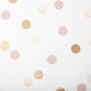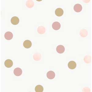 A full roll of this product is 20.5 inches wide and 396 inches long. A full roll can cover up to 56 square feet depending on the design match and pattern repeat. A sample of this product is 8 inches by 11 inches. This watercolor Polka Dots wallpaper is ideal for bedrooms, nurseries and playrooms. The simple yet effective design features an all-over pattern of metallic and hand painted watercolor polka dots in soft complimentary shades on a white background. This colorway features pink and metallic gold polka dots. Offers a smooth, untextured finish. Offset match with a 20.9 inch pattern repeat.