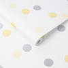 A full roll of this product is 20.5 inches wide and 396 inches long. A full roll can cover up to 56 square feet depending on the design match and pattern repeat. A sample of this product is 8 inches by 11 inches. This watercolor Polka Dots wallpaper is ideal for bedrooms, nurseries and playrooms. The simple yet effective design features an all-over pattern of metallic and hand painted watercolor polka dots in soft complimentary shades on a white background. This colorway features yellow and metallic silver polka dots. Offers a smooth, untextured finish. Offset match with a 20.9 inch pattern repeat.