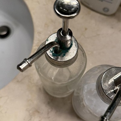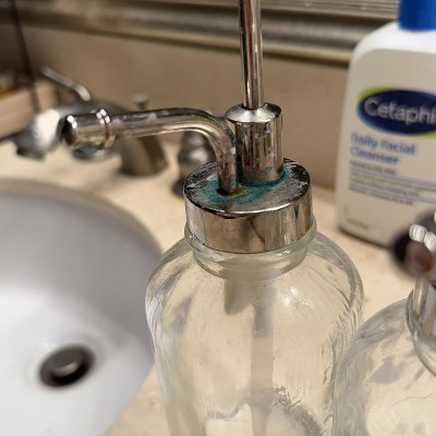 Silver tone material gets rusted when in contact with the dish soap. The inside of the pump is soon covered with a breen/blue ish material that contaminates the dish soap and you don’t notice for a while until you need to refill the soap. This product should be removed