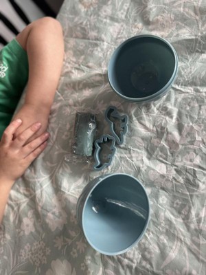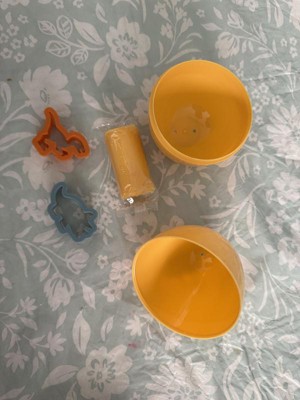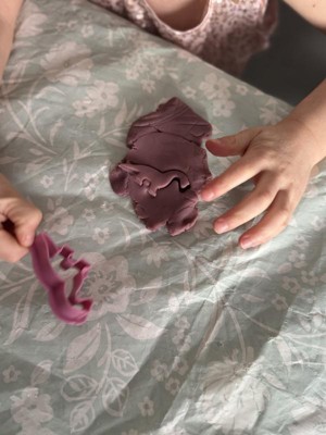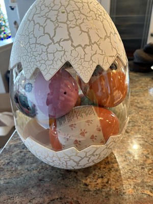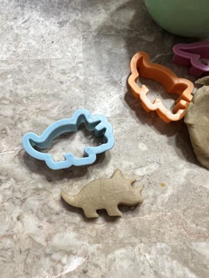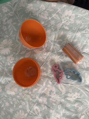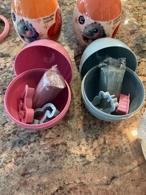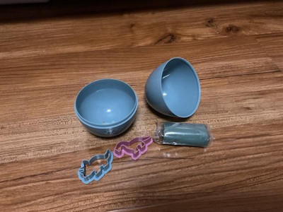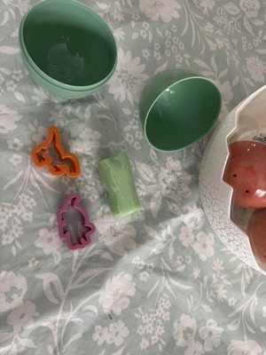 Love this pack of dinosaur eggs with moldable dough! It includes two shape cutters in each egg, with its own pack of super soft dough. Dough is non toxic so not a big hazard to critters on the floor. Love the big egg case that these come in. A very cute design and set out on the table for all the kids to grab their own egg with their own dough and molds without the fights over sharing dough!