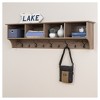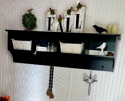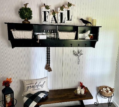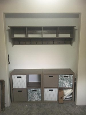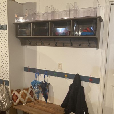 Ideal for an ever expanding household, the 60" Wide Hanging Entryway Shelf will keep your entryway belongings together in one place! Suitable for any front hallway, foyer or mudroom, the four compartments provide ample storage for everyone in your family. Fill with baskets, gloves, mittens, hats and books. Five large and four small hooks provide plenty of places to hang jackets, coats, hoodies, sweaters, bags and purses. Installs easily with our innovative hanging rail system.