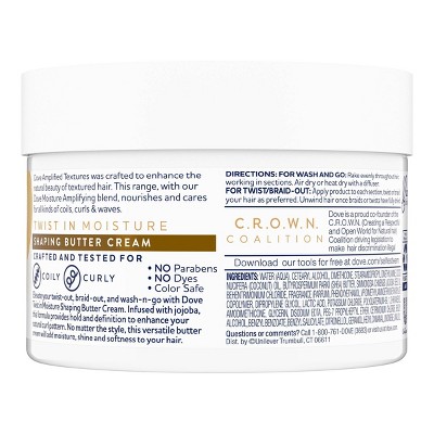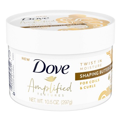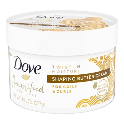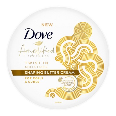 Dove Amplified Textures Shaping Butter Cream is designed to add moisture to hair with coils, curls and wavesInfused with natural ingredients, this curl cream lets you shape and define your curls while adding moisture and shineThis curl defining curling cream hydrates, shapes and amplifies your textured hairThoughtfully crafted for textured or curly hair, this curl defining, frizz control hair cream for women is a great addition to your dry hair treatment routineThis hair styling cream combines coconut oil for hair with shea utter, glycerin and Dove's patented Fiber Actives to deliver moisture, and help nourish and repair curly or textured hairThis hair styling cream is designed to amplifying the beauty of textured hair with its unique moisture blend formula