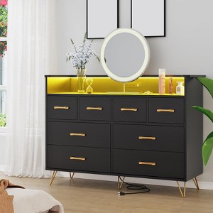 Dresser with Light, Charging Station, 8 Drawers Wooden Dressers, Vintage Chest of Wide Drawers for Bedroom, Living Room, Entryway, Hallway