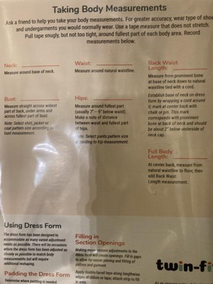 [This review was collected as part of a promotion.] Dritz Twin-Fit Adjustable Dress Form in Petite was a cinch to assemble, as clear instructions were included. Auto-set dials (located at bust, waist, and hips) can be positioned to your own body size measurements. Even the neck size can be increased by rotating the wooden finial. Its expandable pole has printed measurements for your shoulder to floor length, and an adjustable 360° pin hem marker allows for accurate hems. The built-in foam pin cushion provides pin storage, while the foam-backed cover makes for easy pinning. I would recommend this product to others.