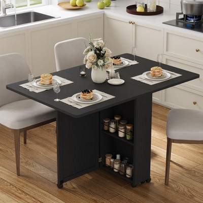 Drop Leaf Dining Table for 4, Space Saving Foldable Kitchen Table with 2 Storage Shelf for Small Spaces, Movable Kitchen Table with 6 Wheels, Gray