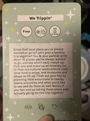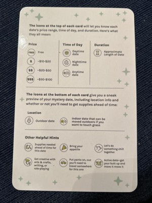 This has been the best anniversary gift for my husband! We have a hard time planning and scheduling dates and now we are making the time because this takes the guess work out of it! We’ve been getting a sitter a few times a month and pulling a card. Definitely pay attention to the icons at the top and the clues at the bottom so you can plan accordingly. Sometimes we only have a couple hours and want to make sure we can complete the date. This has been so easy and fun we’re going to get it for my sister for her anniversary. I highly recommend this game for anyone who needs to make date night a priority, but doesn’t have the time to plan.