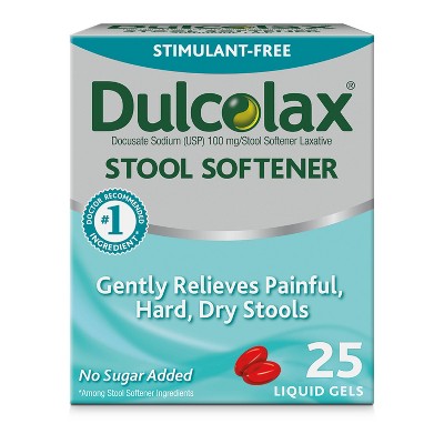 Get gentle relief from painful, hard, dry stools with Dulcolax Stool Softener Laxative Liquid Gels. The active ingredient, docusate sodium, works by hydrating the stool, making it softer and easier to pass. This stimulant free stool softener laxative will gently produce a bowel movement in 12 to 72 hours. For gentle, comfortable relief, trust the No. 1 doctor recommended stool softener ingredient. DIRECTIONS: Take with a glass of water. Adults and children 12 years of age and over: 1 to 3 capsules daily; this dose may be taken as a single daily dose or in divided doses. Children 2 to under 12 years of age: 1 capsule daily. Children under 2 years of age: ask a doctor.