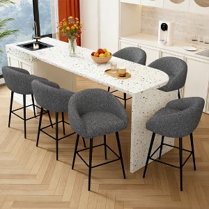 A modern mid-century style barstool featuring arched armrests and a half-back silhouette. Upholstered in soft, breathable fabric with plush padding and curved back support, it ensures lasting comfort at bars, kitchen islands, or dining tables. Built with durability in mind, it includes coated stainless steel legs, anti-scratch floor pads, and a smooth 360¡ã swivel. Overall dimensions: 20.7"D x 23.8"W x 37.4"H. Supports up to 300 lbs.