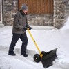 - EFFORTLESS SNOW REMOVAL: Features a large 29”x16.5” steel blade and smooth 10” wheels for easy clearing. Glides across driveways, patios, and sidewalks like a personal snow plow.