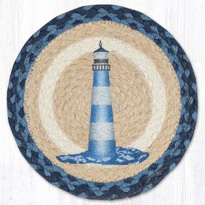 Earth Rugs Blue and White Lighthouse Round Trivet – 10" Nautical Print on Braided Natural Jute