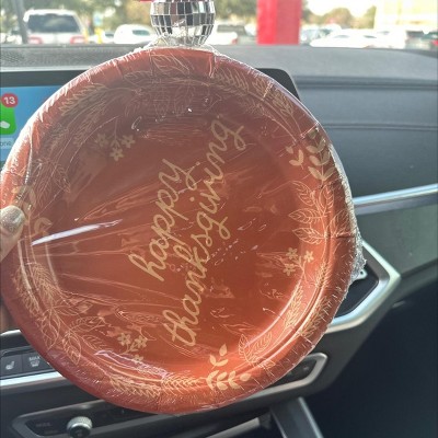 - Festive Thanksgiving paper plates featuring a bold “Happy Thanksgiving” design