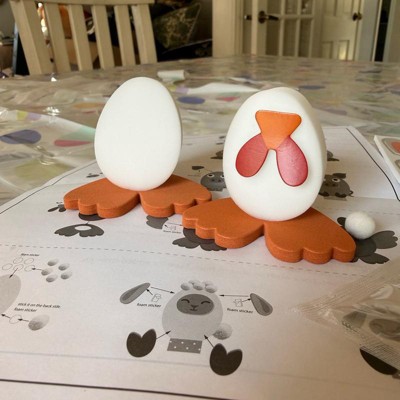 [This review was collected as part of a promotion.] This little kit is adorable! It has foam stickers, pom poms and dye to make five different animals. I didn’t expect the dye and wire egg dipper to be included, so that was a nice surprise. There are also little base cardboard strips to make holders out of. The package says that the dye is food safe but that the sticker adhesive is not, so that is something to keep in mind. The foam stickers have a peel off backing which I did not realize at first, so that will save your little adhesive dots for the pom poms.