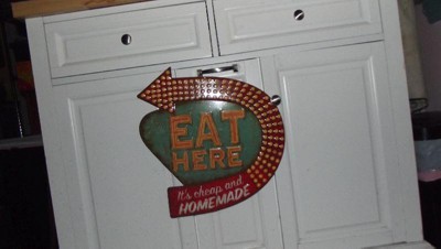 - Add a vintage and fun touch to the walls with this tin "Eat Here" retro wall decor in multicolor
