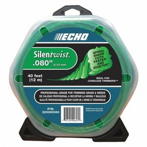 Genuine ECHO replacement part. Silentwist 40' Loop .080" (dia.) Trimmer Line. Twisted shape cross-section offers reduced noise level and a clean, even cut. Unique design maximizes run time to make it the best choice for battery-operated trimmers. Superior durability against hard surfaces like rocks and fence lines.