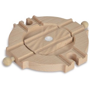 This great eight-way turntable for the Eichhorn wooden railway can be incorporated into railway layouts to allow trains to switch tracks. The small piece of track in the center can be turned so that trains can go in any of the four directions. The Eichhorn railway is manufactured exclusively from FSC 100 percent wood from sustainably managed forests.