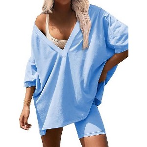 Ekouaer Womens Pajamas 2 Piece Lounge Sets Oversized V Neck T-Shirts Tops Biker Shorts Set Workout Reversible Tracksuit - 1 of 4