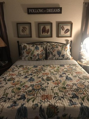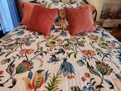[This review was collected as part of a promotion.] I love the Eleni Full/Queen Quilt Set. It is so stylish, & fits perfectly with the guest bedroom decor. Plus, it gives the room a different feel to it. The Eleni Full/Queen Quilt Set features a striking design that draws the eye. My favorite part of floral designs is the vibrant & colorful shades the quilt set has. I like how soft and cuddly it feels. (One) Eleni Full/Queen Quilt and (two)Standard Shamsis included in the quilt set. There are very few requirements to care for the quilt. Just machine wash it on a cold, gentle cycle, then hang it outside on the line to dry or tumble dry it in a dryer at a low temperature. I am pleased with this product & it is a very high-quality product. I would strongly recommend the Quilt Set to my friends, family & others in my circle of influence.