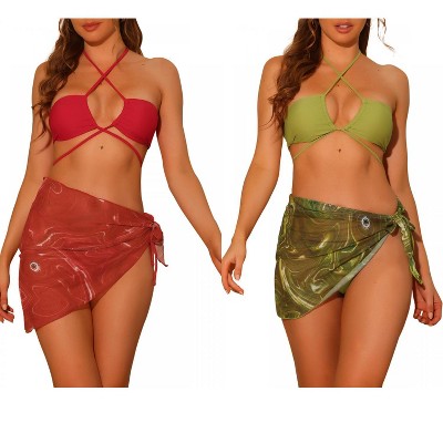 • Feature: 3 pieces, solid color bandeau bikini top, strapless, O ring cinched, tie closure at neck/back/front freely, solid color tie side triangle bottom, single printed colorful mesh sarong beach skirt